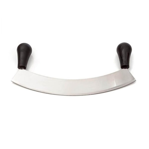Cutit cu doua manere pentru feliat pizza, placinte, foi de aluat. Poate fi folosit si ca tocator. Lama de 350×50 mm, manere din plastic, greutate 360 g.