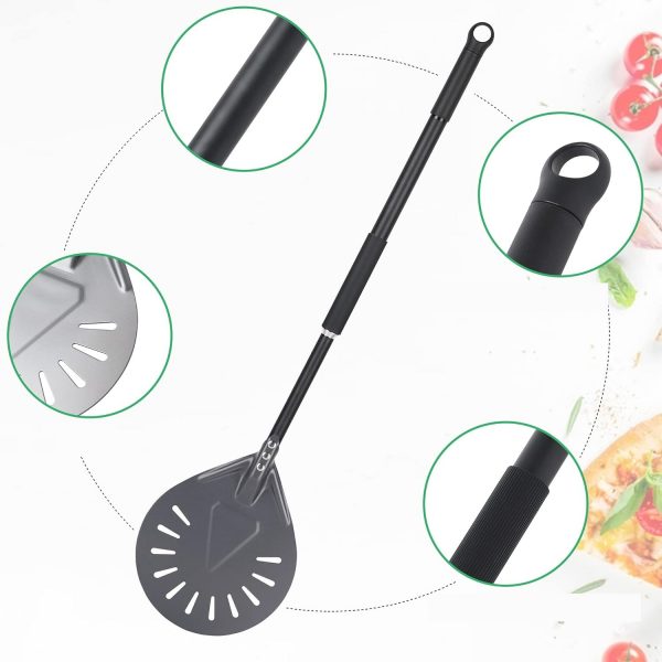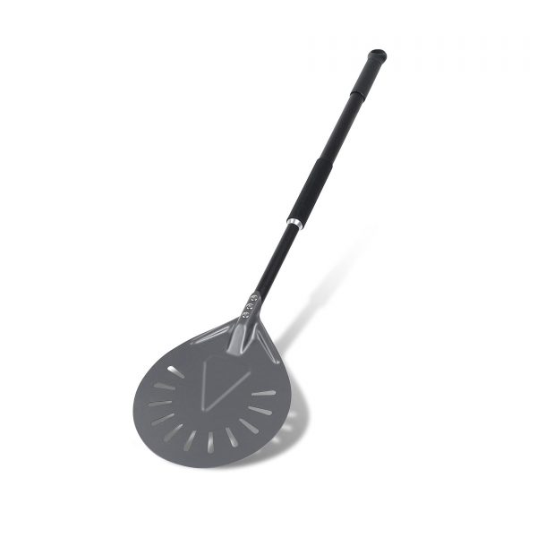 Paleta rotunda de scos si intors pizza in cuptor. Completa fabricata din aluminiu tratat rezistent la zgarieturi si uzura. Discul perforat are 200 mm si coada rotunda cu manson de protectie din silicon. Lungimea totala a paletei este extensibila facand de 89 la 109 cm. ATENTIE – paleta nu are culisant pe coada.